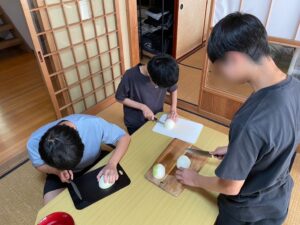 包丁を使ったことがないこともいたので注意をしながら見守りをしていますが、家でお手伝い経験のある寮生がみじん切りの仕方を教えたりと協力し合って取り組むことができています。