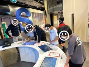 寮生はまずは体を使った科学体験を行っています。入口に魚が近寄ってくる仕組みがあったのですが、寮生はそこからすでに楽しそうにみんなで話をしていました。
