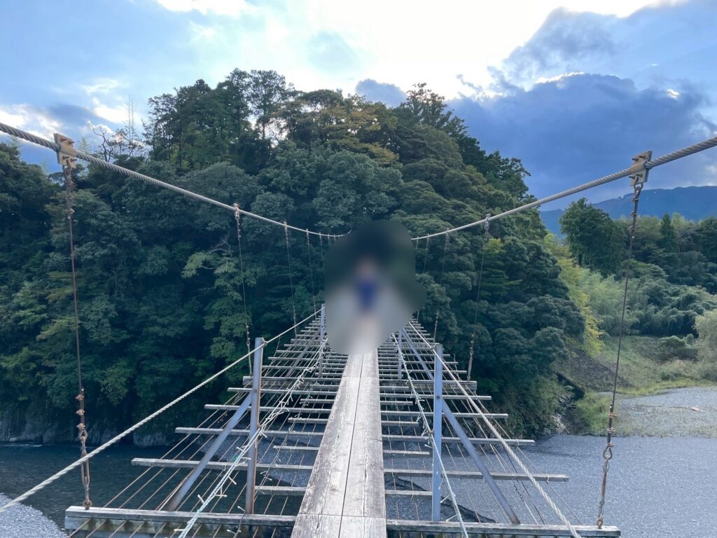 ここは大井川の上を通る一番長い吊り橋です。民家の上にあり、普段できない体験がありました。