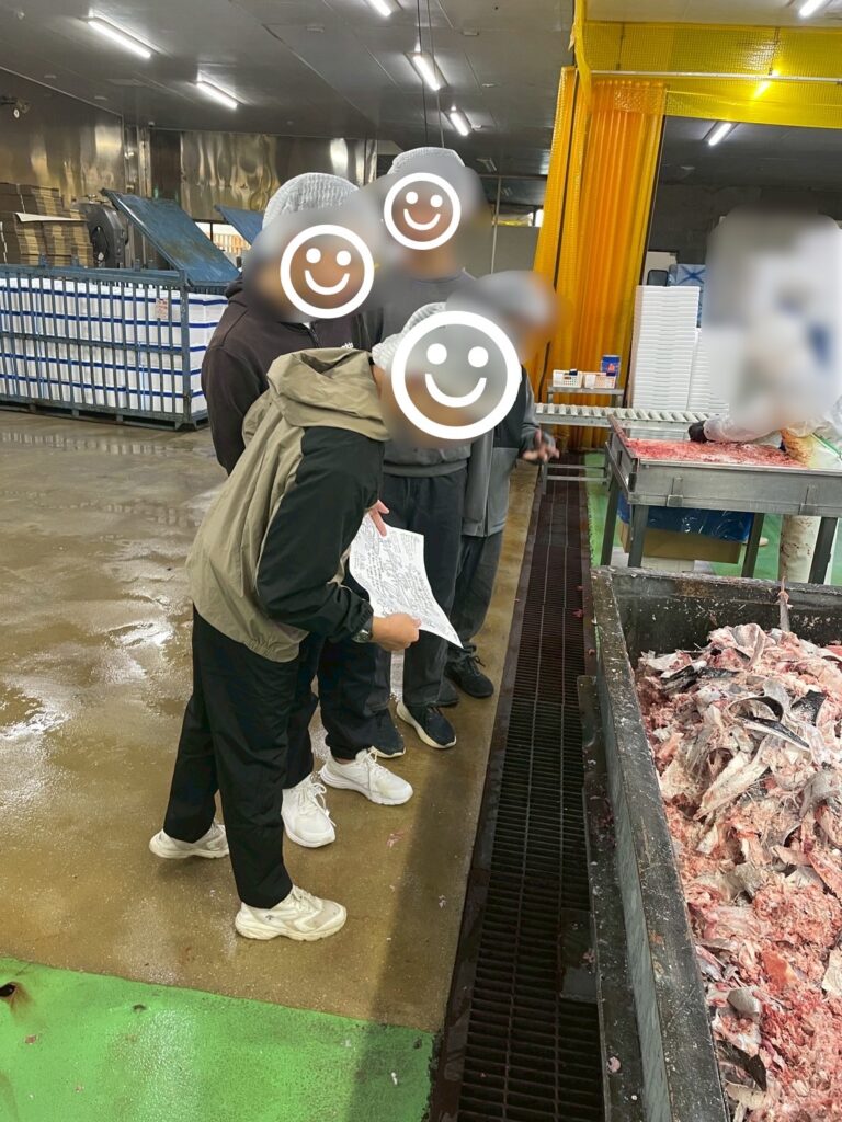 その次は、冷凍マグロの加工場を見学させていただきました。そこでは12個の工程に分けられていました。一見簡単そうですがすべての工程において、働いている人が培った職人技とのことです。また、一つ一つの工程で次に作業する人がやりやすいようにと丁寧にスピーディに行われています。