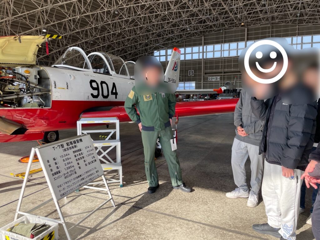 私達の目にはとても広くて大きな基地に感じましたが全国で1番小さな基地という事で、冒頭でお伝えした通り基本的にはパイロット育成の場として1944年から運用されているそうです。最初に概要についてお話いただきましたが、その他にも自衛隊の方の定年退職年齢や訓練機の驚くべき値段等、興味深いお話を聞く事ができました。