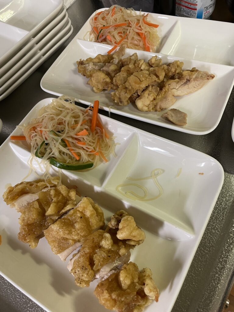 メニューは油淋鶏、スープ、春雨サラダ、りんごのコンフォートです♪