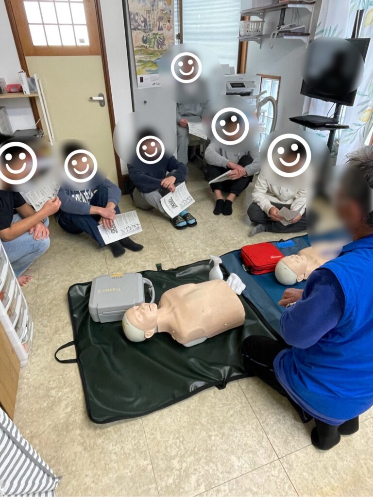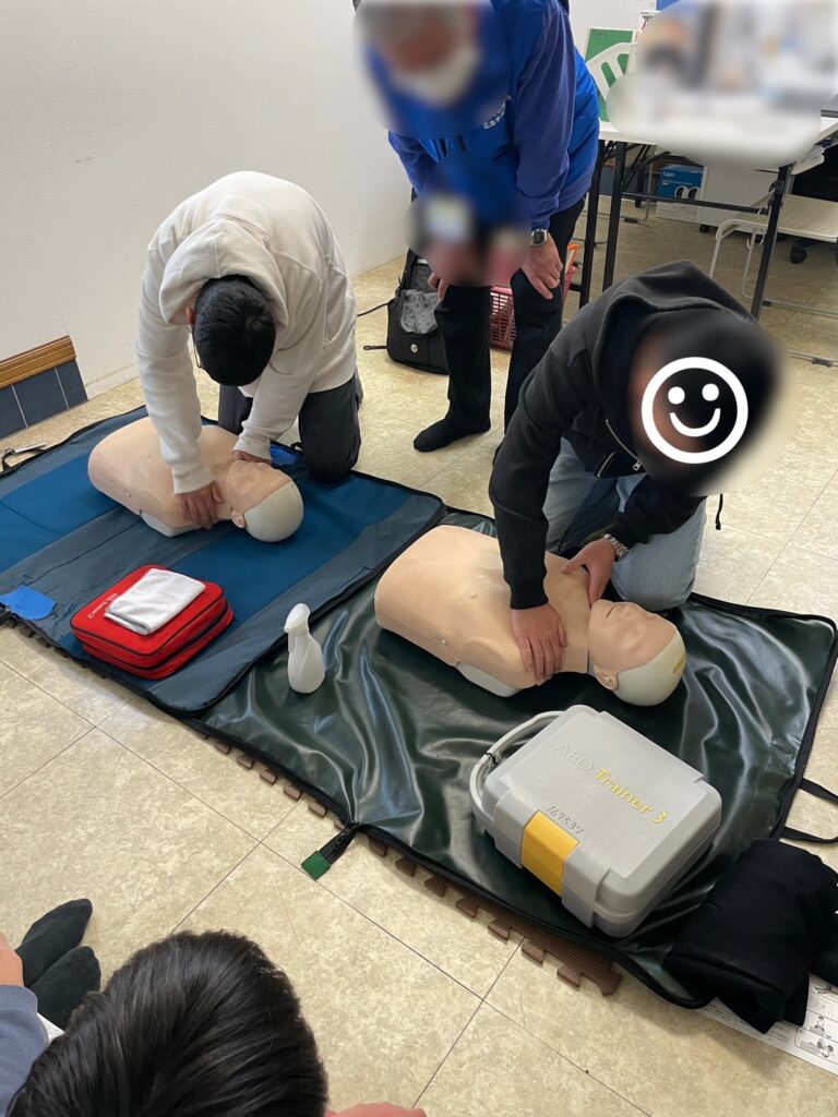 今回の訓練では、怪我人や急病人を発見した瞬間から、胸骨圧迫、AEDの使用方法まで、一連の流れを丁寧に教えていただきました。